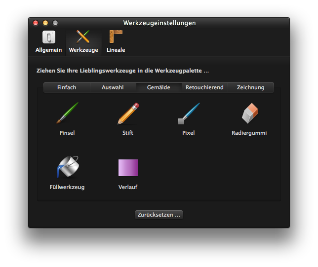 Standardmäßig sind auf der Werkzeuge-Palette nicht alle Werkzeuge zu sehen, die Pixelmator bietet. Dies hat einen einfachen Grund: Übersichtlichkeit. Nicht jeder benötigt immer alle verfügbaren Werkzeuge.