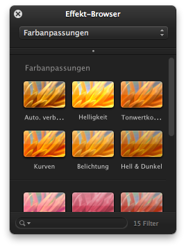 Wählen Sie im "Effekt-Browser" in der oberen Auswahl-Box den Eintrag "Farbanpassungen" aus. Im unteren Bereich werden nun alle dazu passenden Effekte angezeigt.