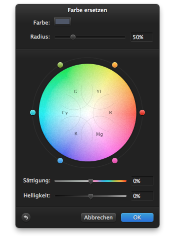 Nun können Sie die Farbe des ausgewählten Bereiches ändern. Sie können dazu auf der "Farbe ersetzen"-Palette die einzelnen Punkte um den Farbkreis herum verschieben oder auch die Sättigung und die Helligkeit über die entsprechendem Schieberegler verändern.