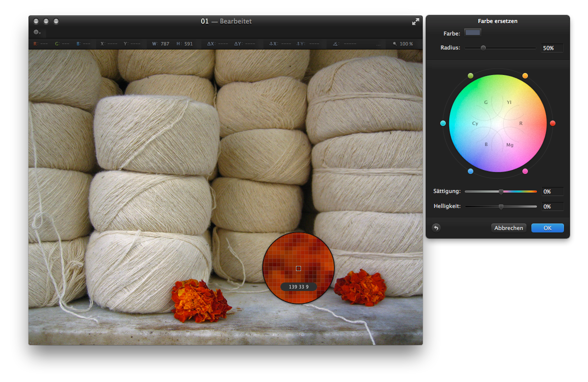 Der "Farben ersetzen"-Effekt in Pixelmator ist sehr leistungsfähig und extrem einfach einzusetzen. Dieses Tutorial zeigt, wie man in einem Foto eine bestimmte Farbe durch eine andere ersetzen kann. Gehen Sie dazu wie folgt vor: