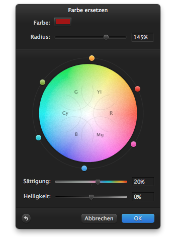 Ich ziehe hier in diesem Beispiel den roten Punkt auf der rechten Seite etwas nach oben (26°) und stelle die Sättigung auf 20% ein.
