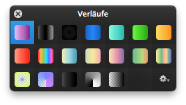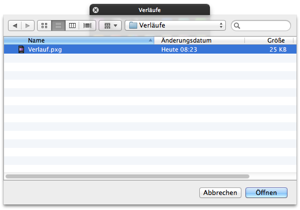 Haben Sie von jemandem eine Pixelmator-Verlauf-Datei (.pxg) erhalten und möchten Sie den Verlauf bei sich importieren, dann klicken Sie auf das Zahnradsymbol in der rechten unteren Ecke der Verläufe-Palette und klicken dann auf den Eintrag "Verlauf importieren ...". Wählen Sie in dem darauf folgenden Dialog die gewünschte .pxg-Datei aus und klicken Sie dann auf den "Öffnen"-Button.