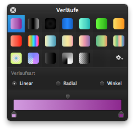 Sie können hier festlegen, ob der Verlauf linear, kreisförmig oder in einem Winkel sein soll. Auch können Sie festlegen, welche Farben Sie für den Verlauf verwenden möchten. Um dem Verlauf eine zusätzliche Farbe hinzuzufügen, klicken Sie auf die gewünschte Position unterhalb des Farbbalkens. Durch einen Klick auf den Marker können Sie dann die Farbe über die Farben-Palette auswählen. Um einen Farbe vom Verlauf zu entfernen, ziehen Sie den Marker einfach aus der Verläufe-Palette heraus.