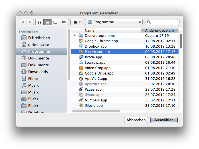 Es wird ein "Programm auswählen"-Dialog angezeigt. Wählen Sie hier Pixelmator (Programme -> Pixelmator.app) aus.