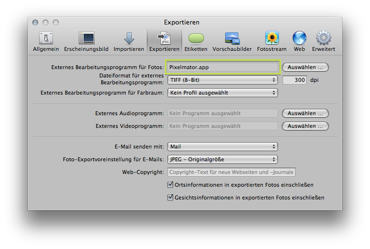 Pixelmator wurde nun in das Feld "Externes Bearbeitungsprogramm für Fotos" eingetragen.