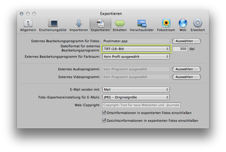 Wählen Sie aus der Select-Box "Dateiformat für externes Bearbeitungsprogramm" den Eintrag "TIFF (16-Bit)" aus. Durch die Auswahl dieser 16-Bit-Option ist sichergestellt, dass Sie mit der maximalen Zahl der Farben (hier 16-Bit), die von jedem Pixel dargestellt werden kann, arbeiten.