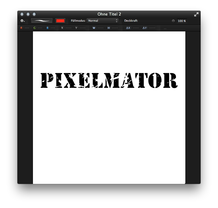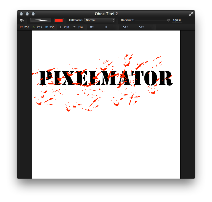 ) ein paar Mal über den Schriftzug "PIXELMATOR" auf der Arbeitsfläche. Jeder Buchstabe sollte nun ein paar Spritzer rot abbekommen haben.
